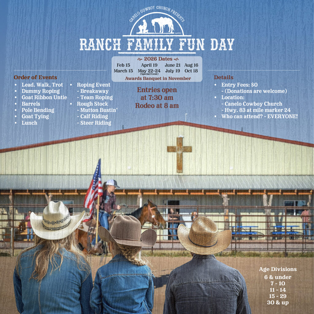Once a month, we gather at the church arena located at mile marker 24 on Highway 83 for Ranch Family Fun Day. It is a fun filled day of rodeo activities for the whole family, and participation in the events is completely free.
